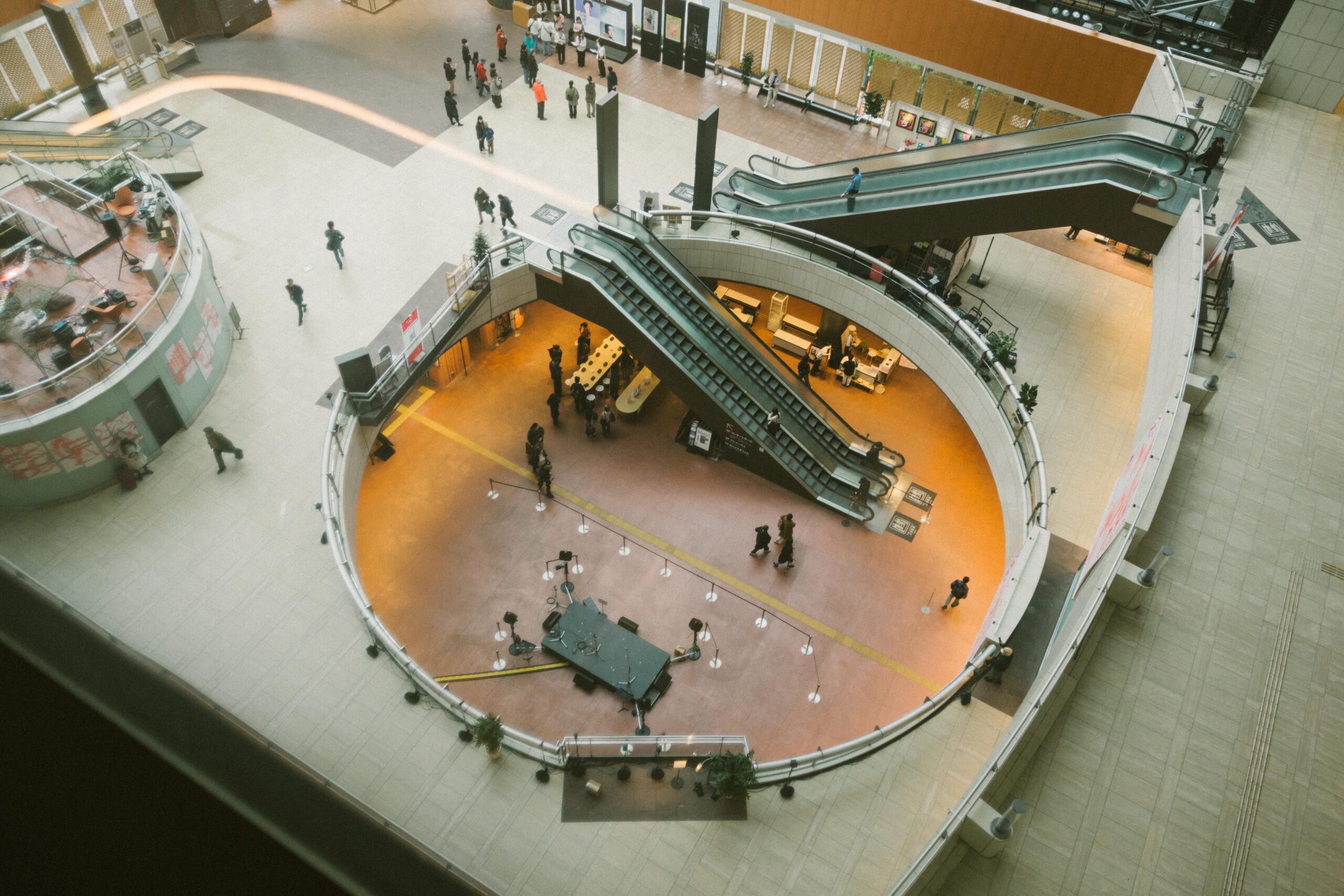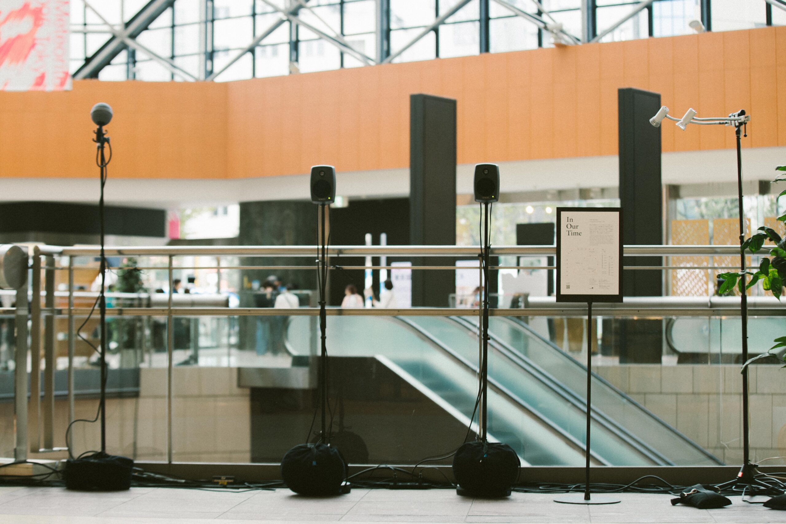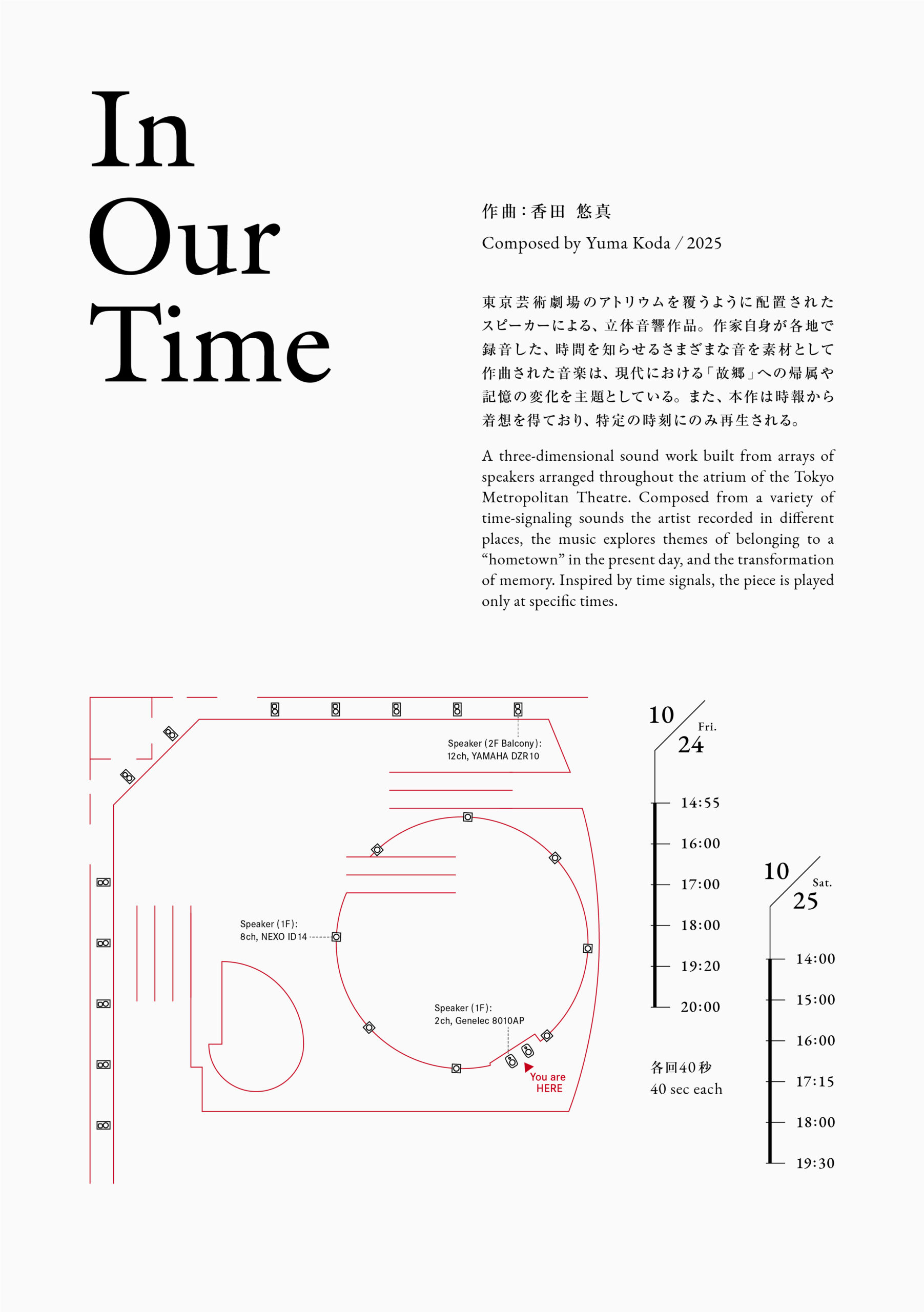 A three-dimensional sound work built from arrays of speakers arranged throughout the atrium of the Tokyo Metropolitan Theatre.